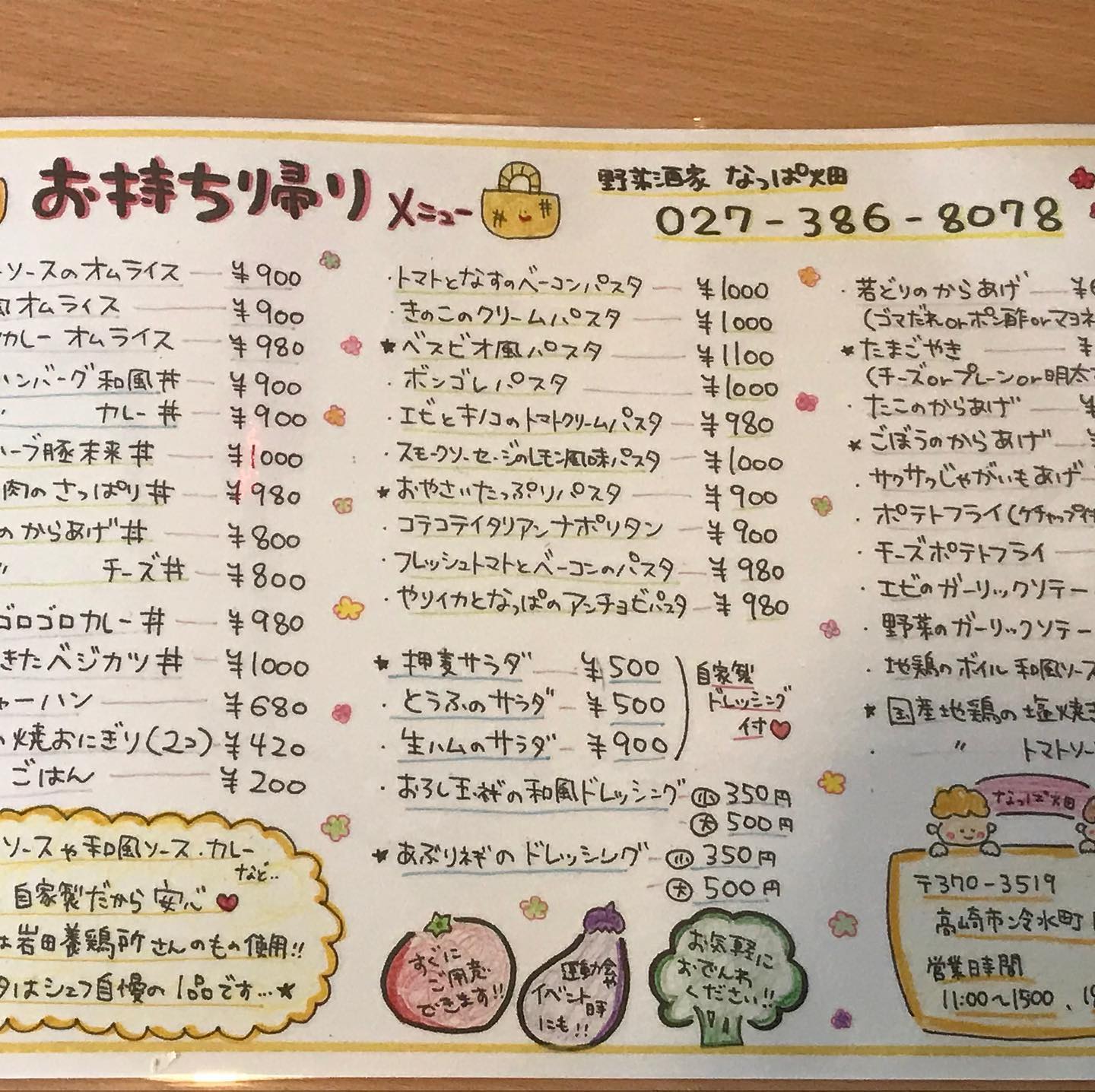 お持ち帰りメニューです^o^-なっぱ畑-お持ち帰り 2020年10月23日Full resolution (1440 × 1436) ← Previous Next → お持ち帰りメニューです(^o^)