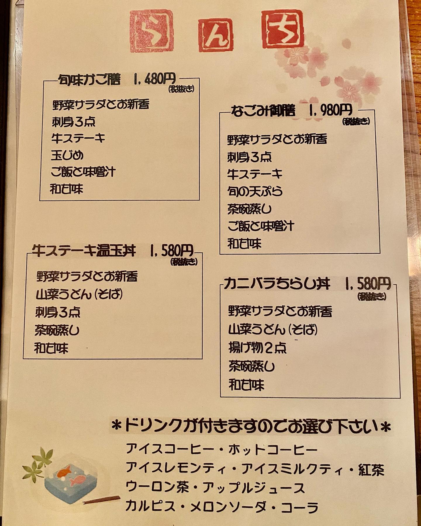こちらは祝日、休日ランチメニューになります。 休日のご飯は白飯のみですが、おかわりでき、ドリンク付です。
