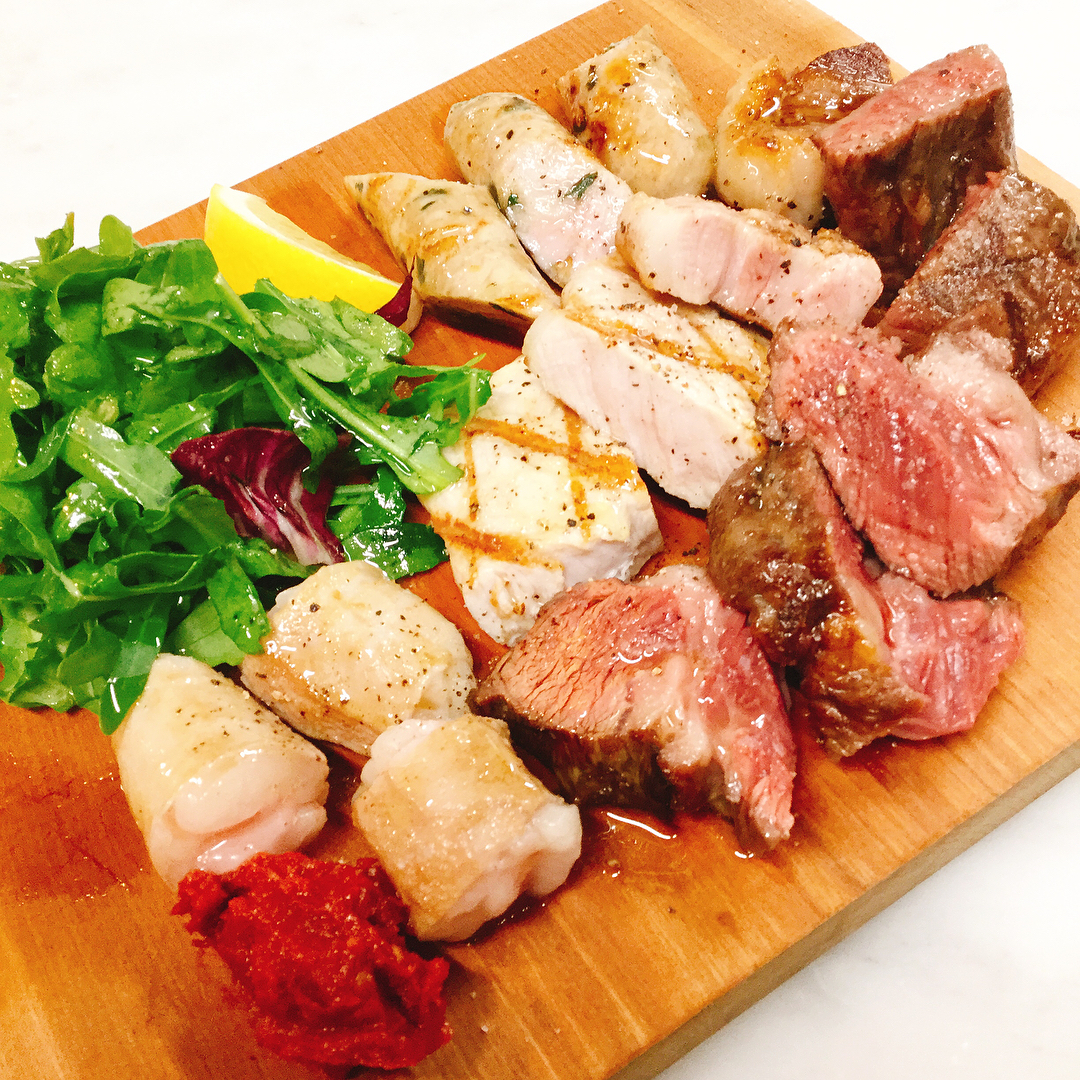 ご好評頂いてます️ おまかせ肉盛り合わせ 写真は、 ・黒毛和牛ランプ ・米国産牛肩ロース ・国産牛マルチョウ ・青森産豚ロース ・サルシッチャ です ボリュームあります️ オススメです😎 そして、2枚めはカボチャのポタージュ 太田産の絶品カボチャを使った濃厚なポタージュです️ 温製、冷静どちらもできます