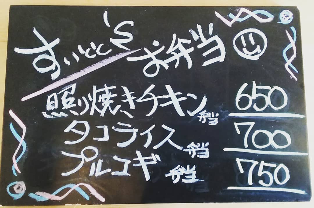 ご注文 お受け致します。 …と言う事で明日の お弁当ラインナップです! 照り焼きチキン弁当 650 タコライス弁当 700 プルコギ弁当 750 の三種類になっております! ご注文、8日9時までに お願い致します…m(_ _)m 【すいとと】 11:30~14:00まで お持ち帰りOK!! イートインにて店内での お食事も可能です。 ☆★☆店内限定☆★☆ 『アサリとトマトのパスタ』 …もオススメです♪ 【鯱家】 12:00~13:00の間に 鯱家店舗にてご注文の お客様のみ受け渡し させて頂きます。 前もってのご注文お待ち しておりますm(_ _)m ・ ・