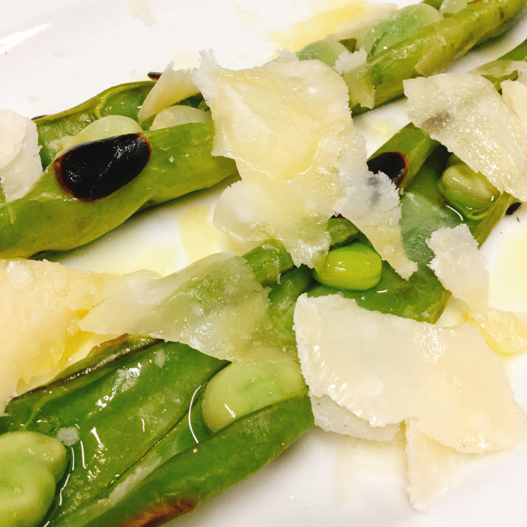 そら豆とパルミジャーノ-西洋種のそら豆は小さめですが香りが良く、皮ご