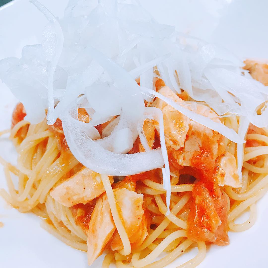 フレッシュトマトとサーモンのパスタ-新玉ねぎを添えて!新メニューにす