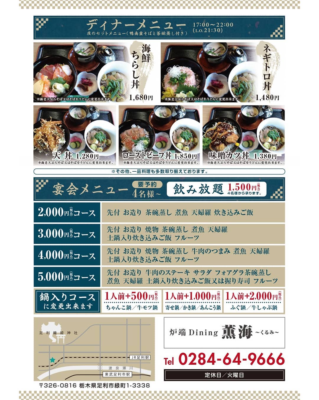 メニューチラシが出来上がりました。 ご協力してくださった方々ありがとうございます。 ご来店されたお客様にはお配り出来ますので、是非一度ご来店くださいませ。 本日も宜しくお願い致します。 栃木県 足利市 炉端Dining薫海 くるみ メニュー チラシ リニューアルオープン 和食 ランチ ディナー テイクアウト 飲食店開業 コロナに負けるな