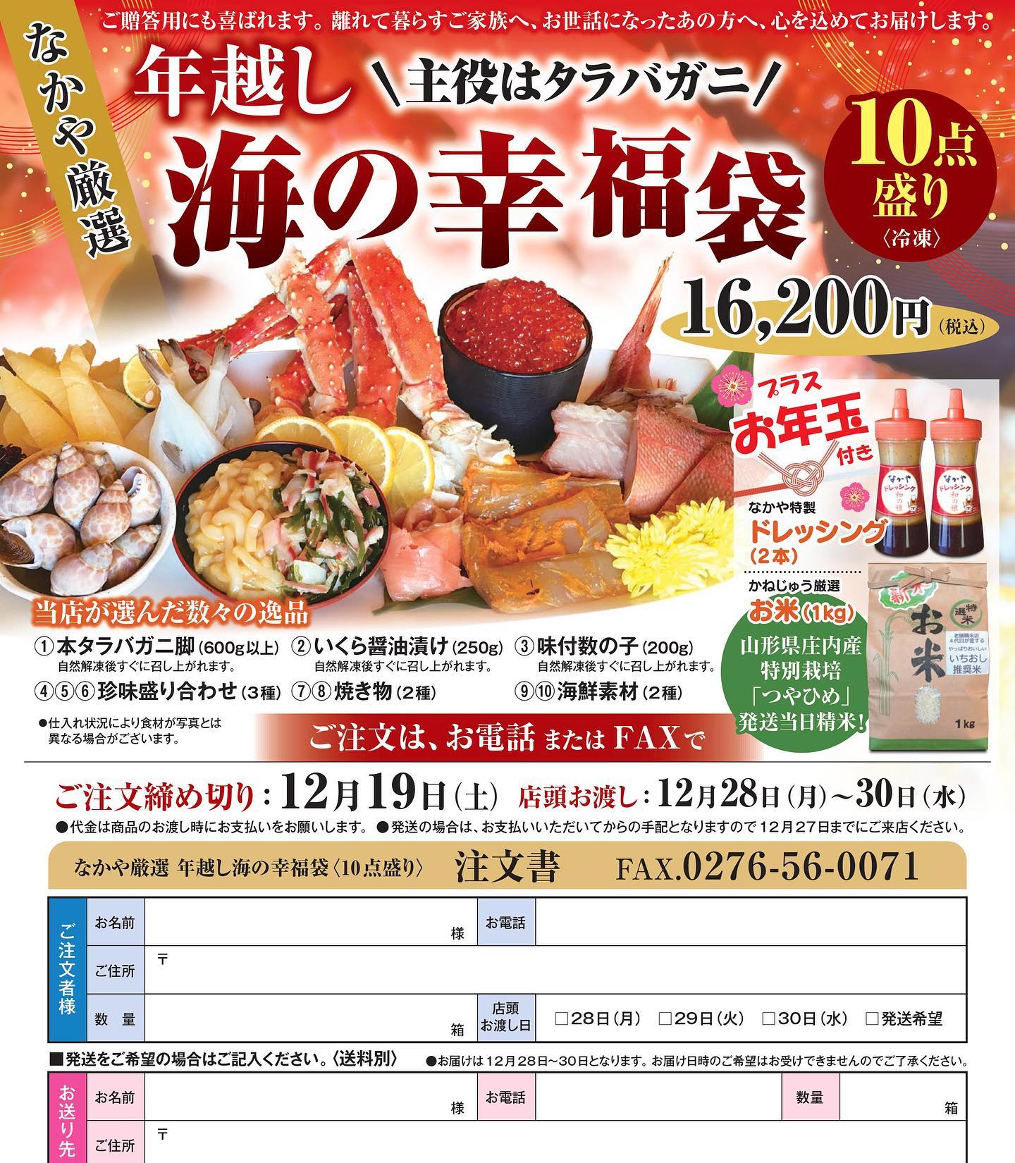 冬の会食プランのチラシができましたので紹介させていだきます。 今回は5種類の小鍋から1種類を選んでいただける形です。(グループ全員統一となります) 海鮮鍋、肉鍋があり味もそれぞれ違います。 裏面は今回初となる、当店厳選年越し用海鮮詰め合わせの販売をします。 ご注文の際はお電話、FAXでも受け賜ります。 締め切りがありますので、ご注意下さい。 こんなご時世ではありますが、お気軽に足を運んで下さい。