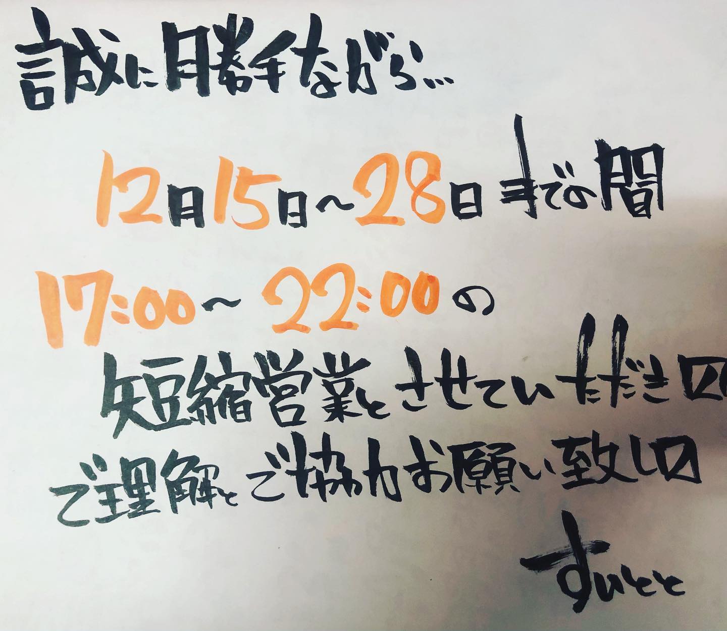 12月15日〜28日まで 短縮営業とさせていただきます。 美味しいぬる燗や痛風になりそうなおつまみが揃っております。 これからもよろしくお願いします。