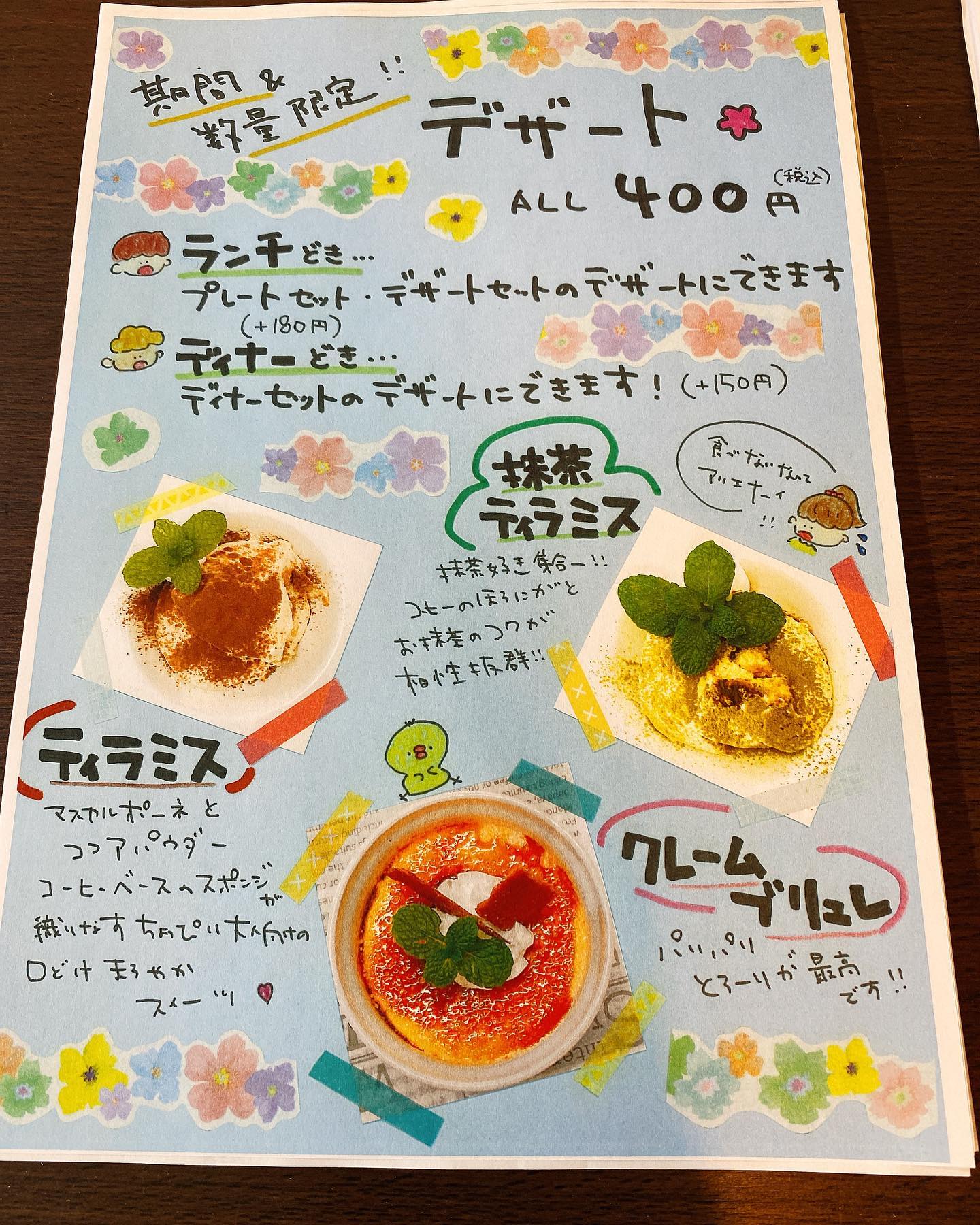 12月からのデザート新メニュー🧁 ティラミス 抹茶のティラミス ブリュレぜひなっぱ畑に遊びに来て下さいね♪