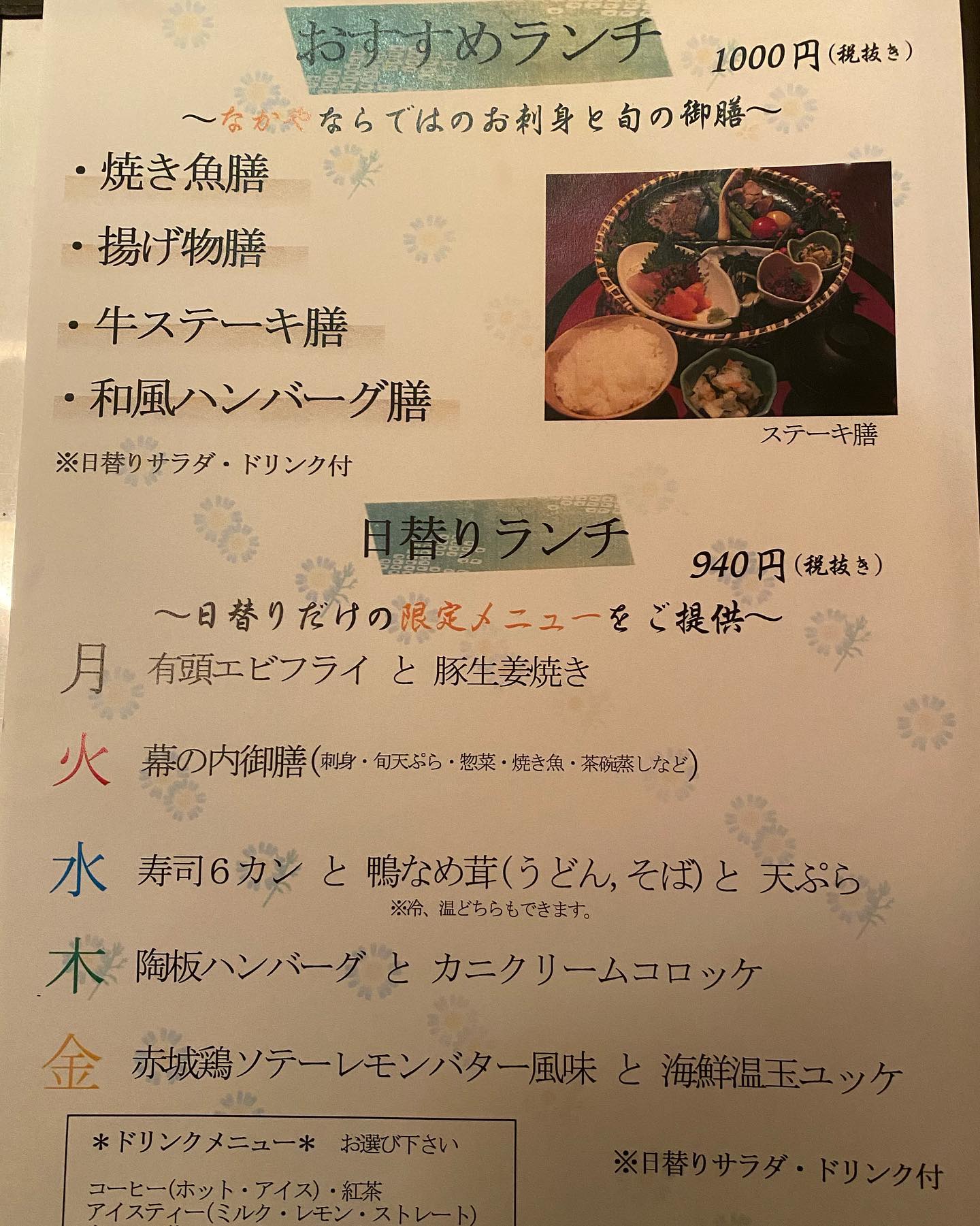 12月になり、今年もあとわずかになりました。 平日ランチメニューの紹介をさせていただきます。 平日はご飯が2種類、白飯と炊き込みご飯があり、おかわりできます。ドリンク付きです。 デザート付のセットやミニ丼と麺のセットなど色々な種類があります。 お気軽にお越しください。 ご来店お待ちしております。