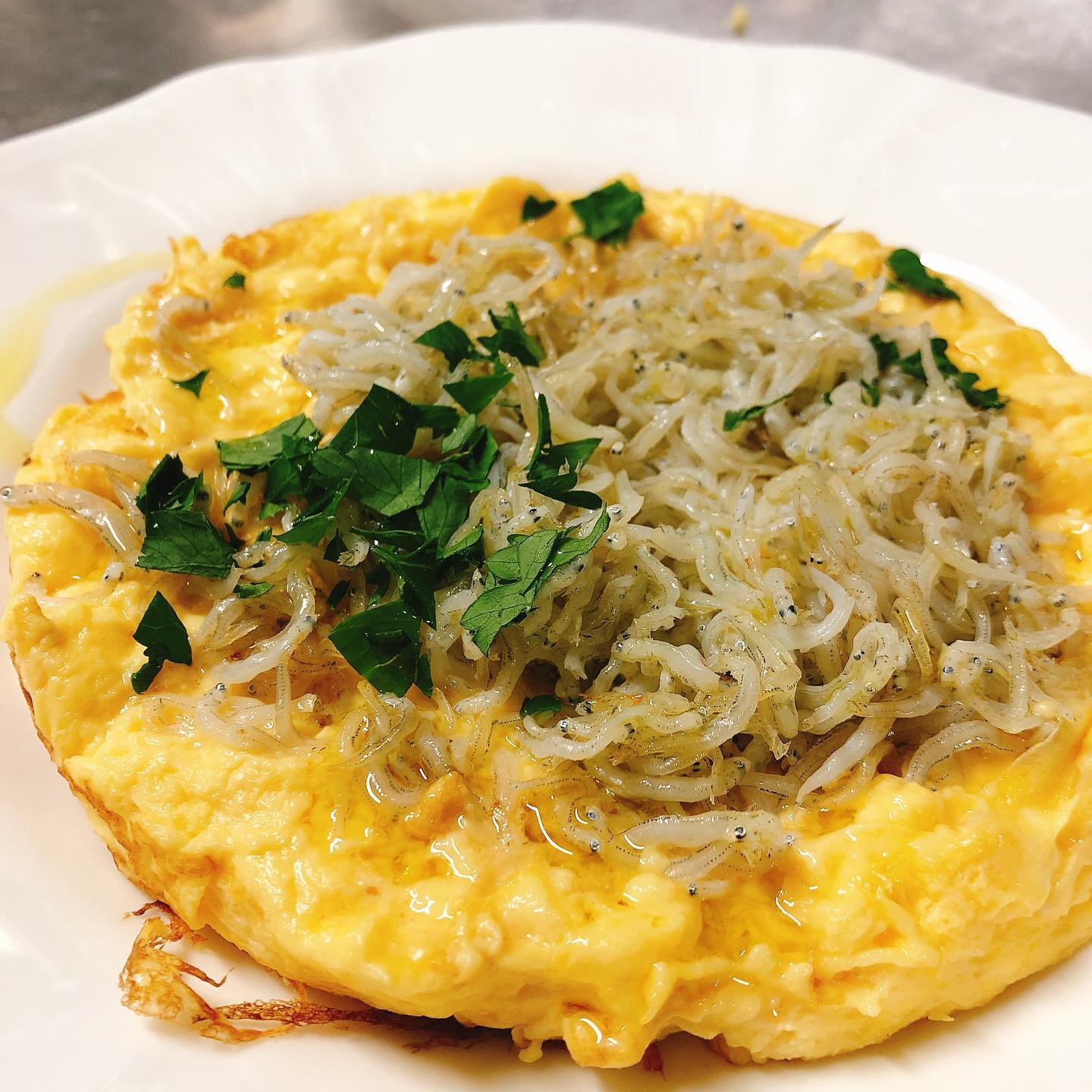 しらすのオムレツ️ しらすと卵の相性バッチリです 本日もテイクアウト、配達やってます!前菜、メイン、パスタまで入ったお得なオードブル人気です️ よろしくお願い致します🏻 #肉の盛り合わせ  #群馬  #イタリア料理