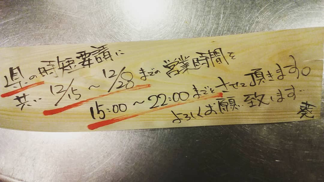 こんばんは! お知らせですが 県の時短要請に ともない 15日~28日までの 2週間営業時間を 短縮させて頂きます。 15:00~22:00までと なりますので 宜しくお願い致します。 ・ ・ #15日~28日