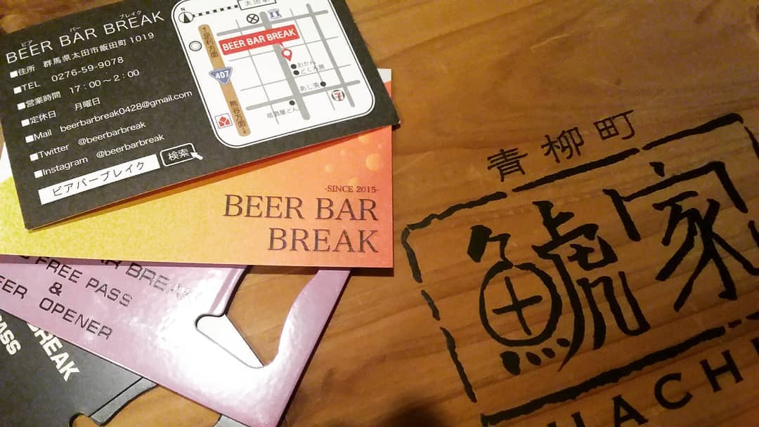 こんばんは!! ここの所好きで 通わせて頂いてる BEER BAR BREAKさん からショップカード いただいたので ご紹介v(・∀・*) 2号店すいとともある 太田で商いされていて 美味し過ぎる クラフトビールが たくさん用意 されています!! 種類がありすぎて 迷った方は店員さんに 聞いて頂ければ親切に 案内してくれますので ご安心下さい♪ ビール好きの方は ぜひ一度足を運んで みて下さいませ! 気づいたら横で 葵も飲んでるかも 知れません(。-∀-)笑 それでは本日も よろしくお願いします ・ ・