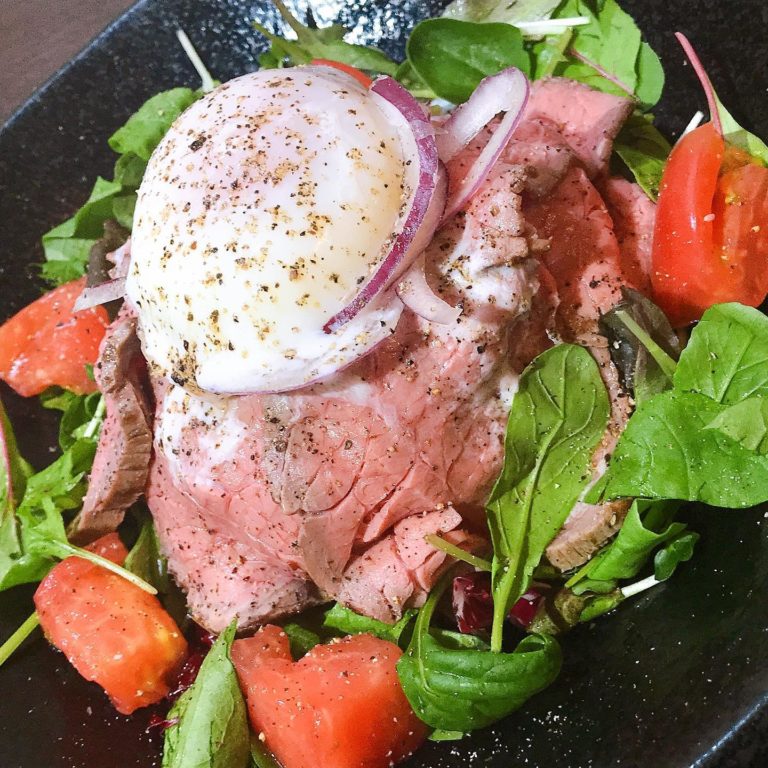 人気のローストビーフ トロトロの卵を️上にのせ シャキシャキのスライスオニオン🧅の相性が抜群生姜と国産ニンニクの秘伝のソースで召し上がれ