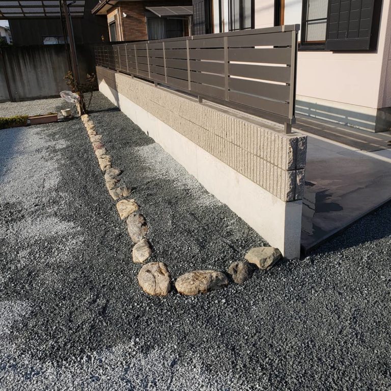 コンクリート基礎+ブロック+フェンス完了しました石を並べて車止め代わりです。和モダン風に仕上がりました。