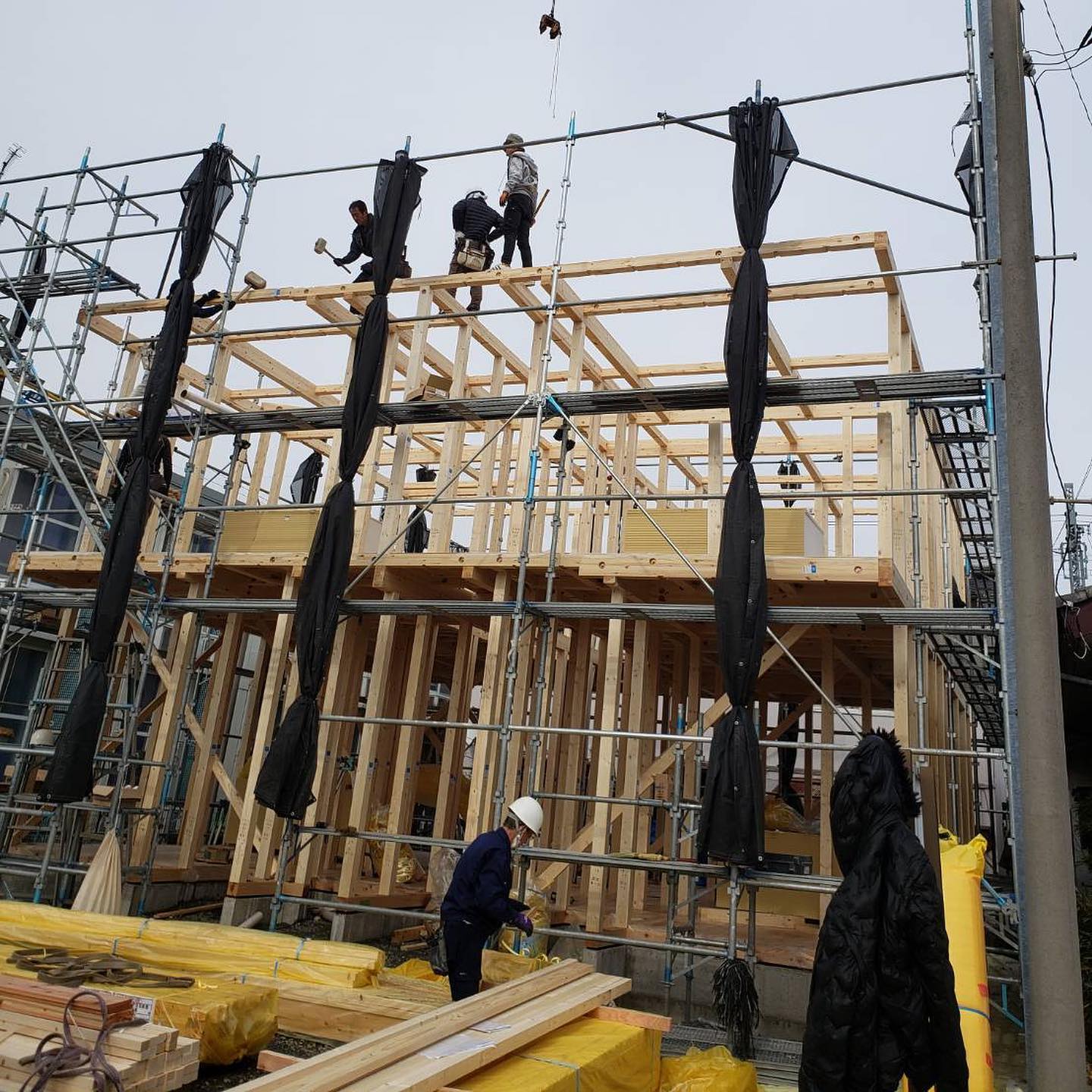 アパート新築工事 建方 天候により延期し、本日建方を行いました。 安全第一で大工さんや職人さんが手際よく組み立てていきます。 順調に作業が進み、あっという間に午後には建物の形が見えてきました このあと屋根工事や外壁工事、内装工事など続きますが、引き続き安全第一で作業を進めてまいります。 本日お手伝い頂いた職人さん、ありがとうございました。 新築工事 リフォーム工事 建方 アパート新築 松島内装 新松建美
