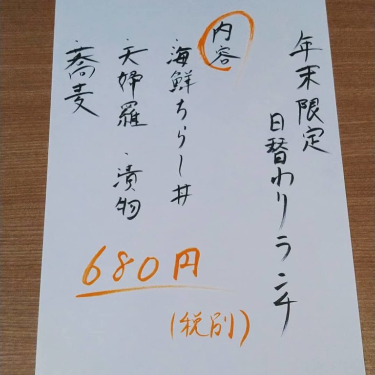 aeascyyaaae-30aeya31aeyaaeyaeaasafafafacayafafafyafaaasaaae-aza 2020年12月23日Full resolution (1080 × 1080) ← Previous Next → 【お知らせ】 30日と31日の日替わりランチは特別メニューになります。 ◎内容は海鮮ちらし丼、天婦羅、お蕎麦(温)、漬物が付きまして変わらず通常価格の680円(税別)でございます。 年内最後のランチを是非くるみでお過ごしくださいませ。