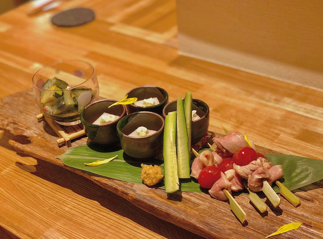 本日のお通し(¥490) ・里芋のねり豆腐 ・合鴨ロース串 ・無農薬野菜の山東菜 ・季節野菜の揚げ煮