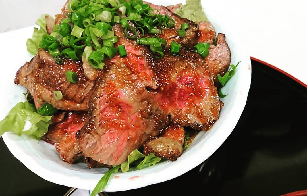 たっぷり 黒毛和牛ステーキ丼! テイクアウト用に始めたのですが、お店でも出してとの声から夜のメニューでも販売中♪ たっぷり200グラム以上! おすすめです♪ TO イート