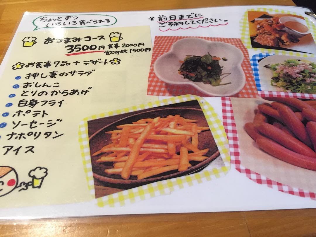 おつまみコース お食事7品デザート *押し麦サラダ *おしんこ *鳥の唐揚げ *白身フライ *ポテト *ソーセージ *ナポリタン ☆アイス 、 ちょっとずついろいろ食べられる 、 2時間飲み放題付 3500円(税込)